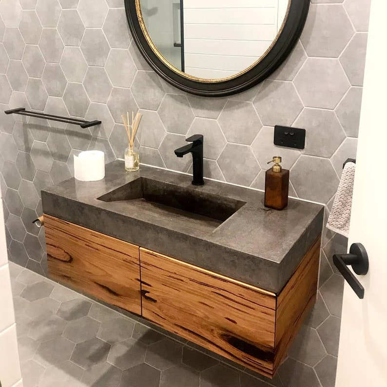 check out our concrete vanity top selection for the very best in unique or custom, handmade pieces from our bathroom vanities shops.   concrete is excellent for making a vanity top! Concrete is a fun and cheap way to get an industrial look.  stop by to see how i built my concrete vanity top to go in my modern spa bathroom remodel.   this is the easiest diy concrete vanity top and it costs less than $50.  beautifully made modern bathroom vanity tops. Concrete is a simple medium to work with even though it is a little messy, the finished product of a concrete vanity top is absolutely worth it! I'll show you how to make it, hang a undermount sink, finish it and yo. Do you follow me on instagram and pinterest?